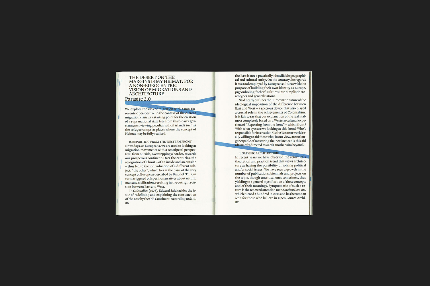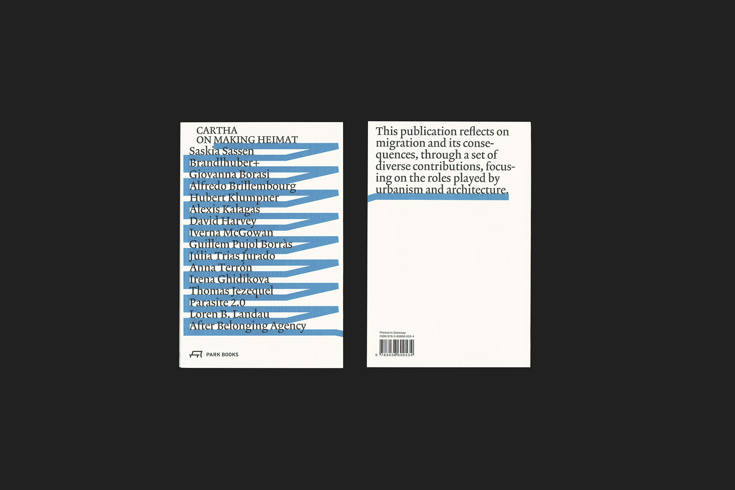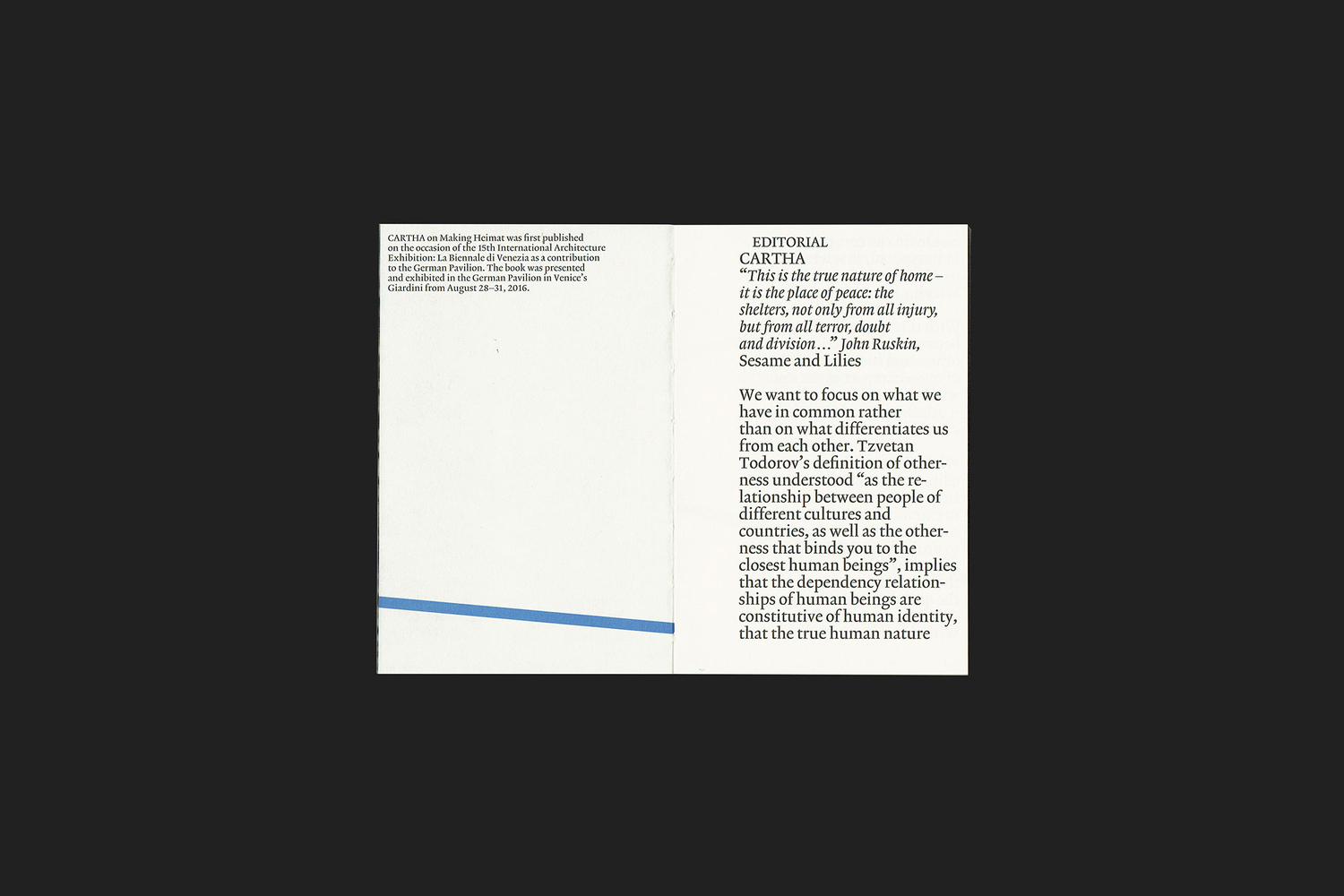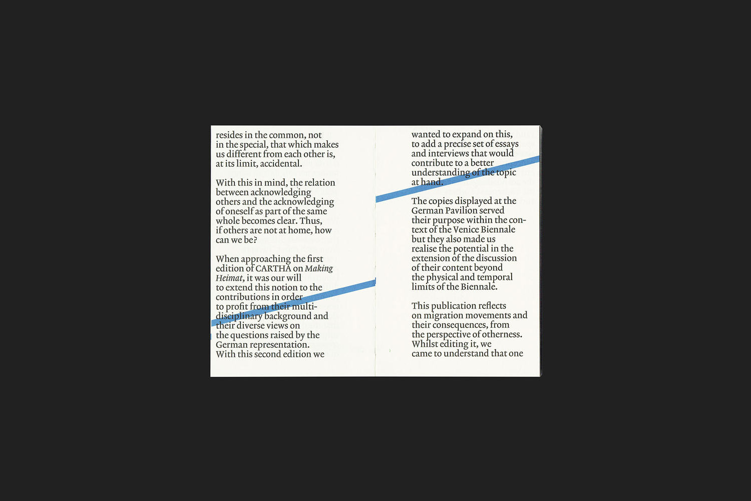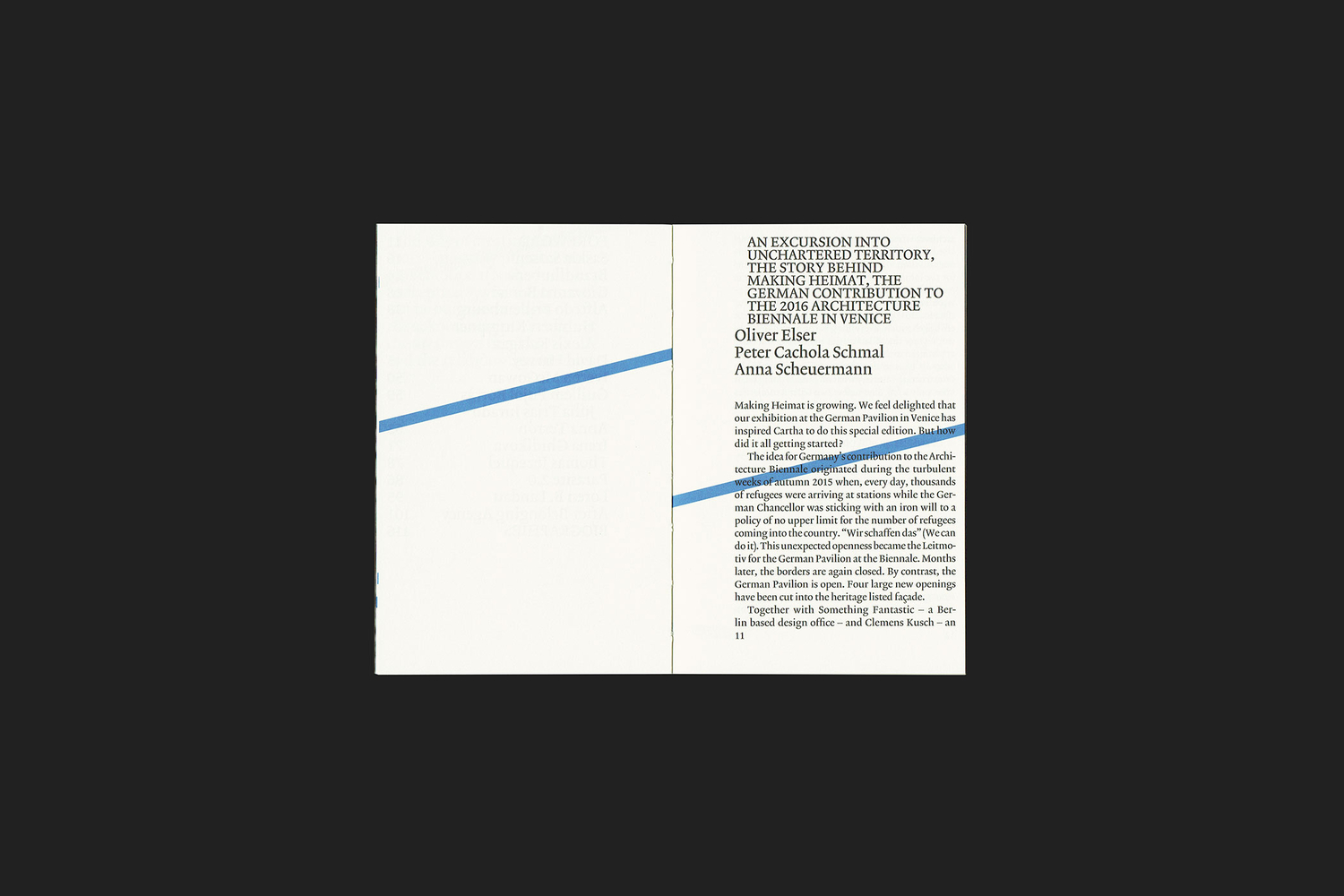 The architecture magazine Cartha was invited to contribute a special issue for the German pavilion at the 15th architecture biennale in Venice. The publication reflects on migration movements and their consequences. The booklet is supposed to be a migrant inside the exhibition space. Every contribution within the book can be seen as a part of the journey searching for "Heimat". This movement is made visible throughout the book by the evolving design of every contribution’s cover page.