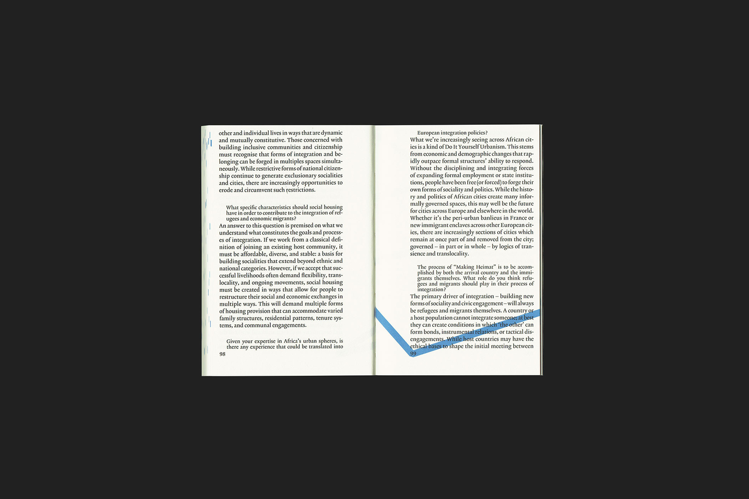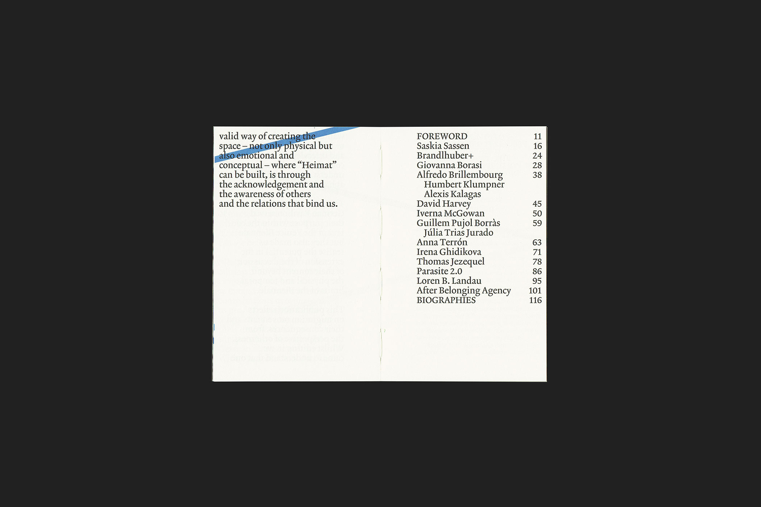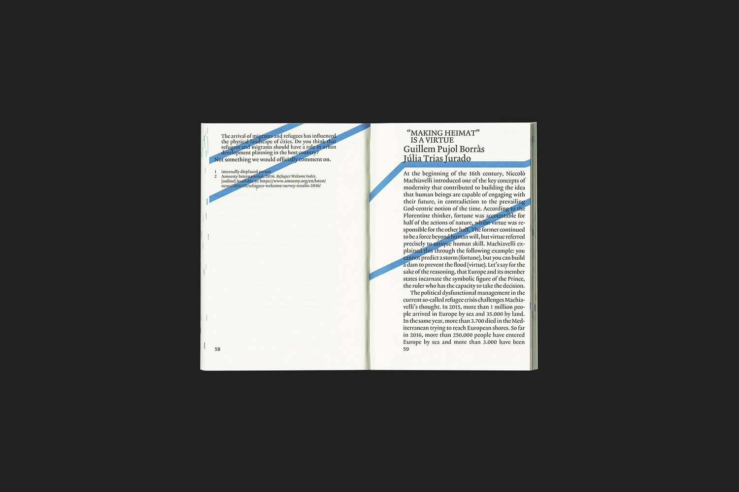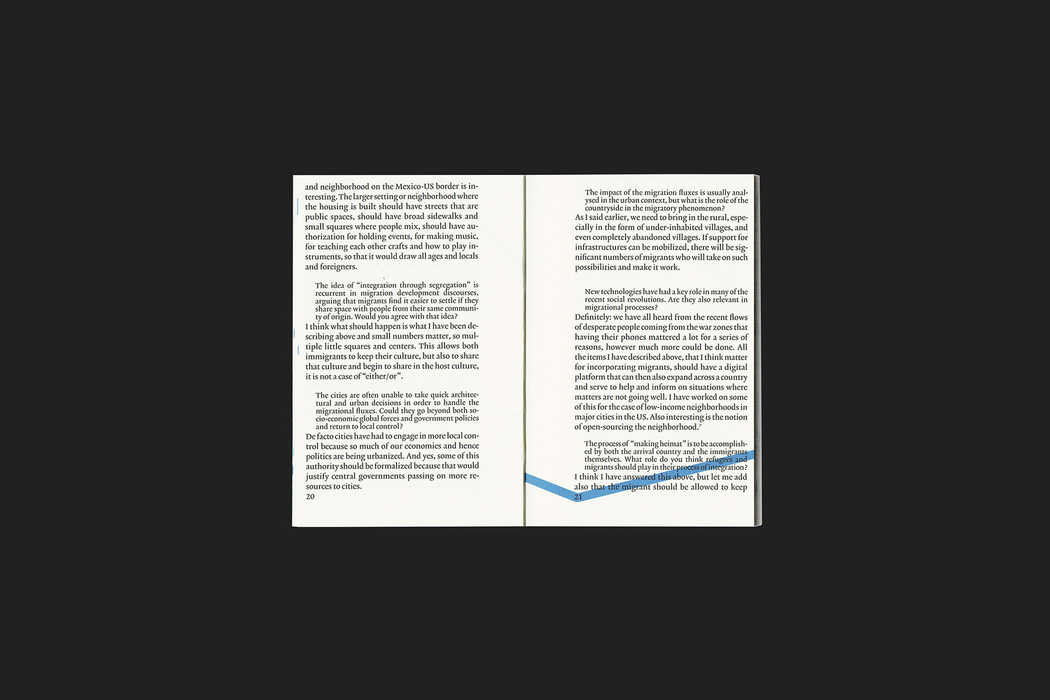 The architecture magazine Cartha was invited to contribute a special issue for the German pavilion at the 15th architecture biennale in Venice. The publication reflects on migration movements and their consequences. The booklet is supposed to be a migrant inside the exhibition space. Every contribution within the book can be seen as a part of the journey searching for "Heimat". This movement is made visible throughout the book by the evolving design of every contribution’s cover page.