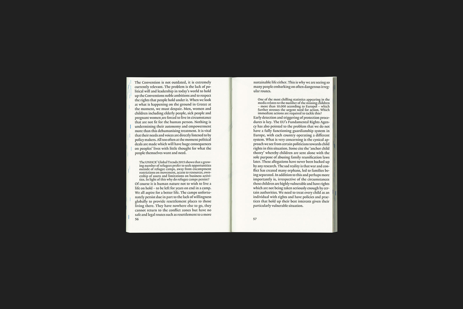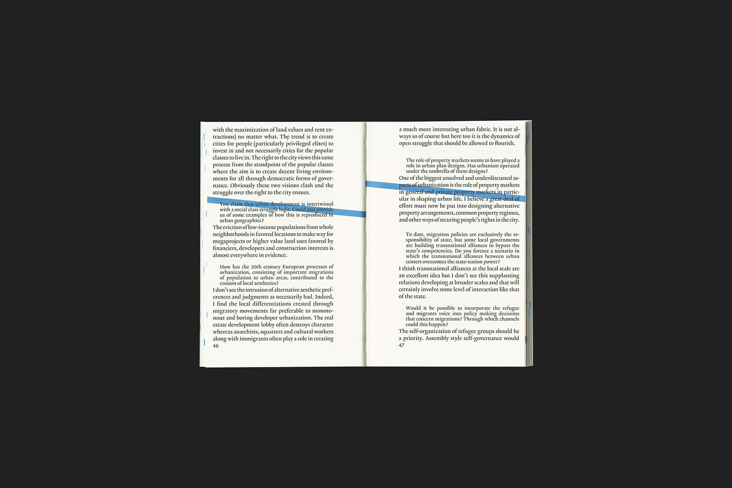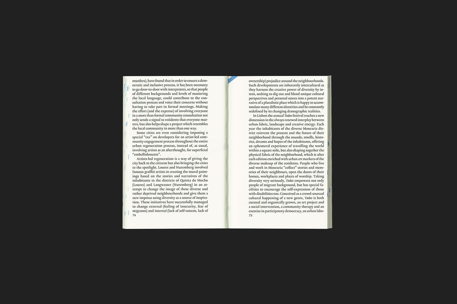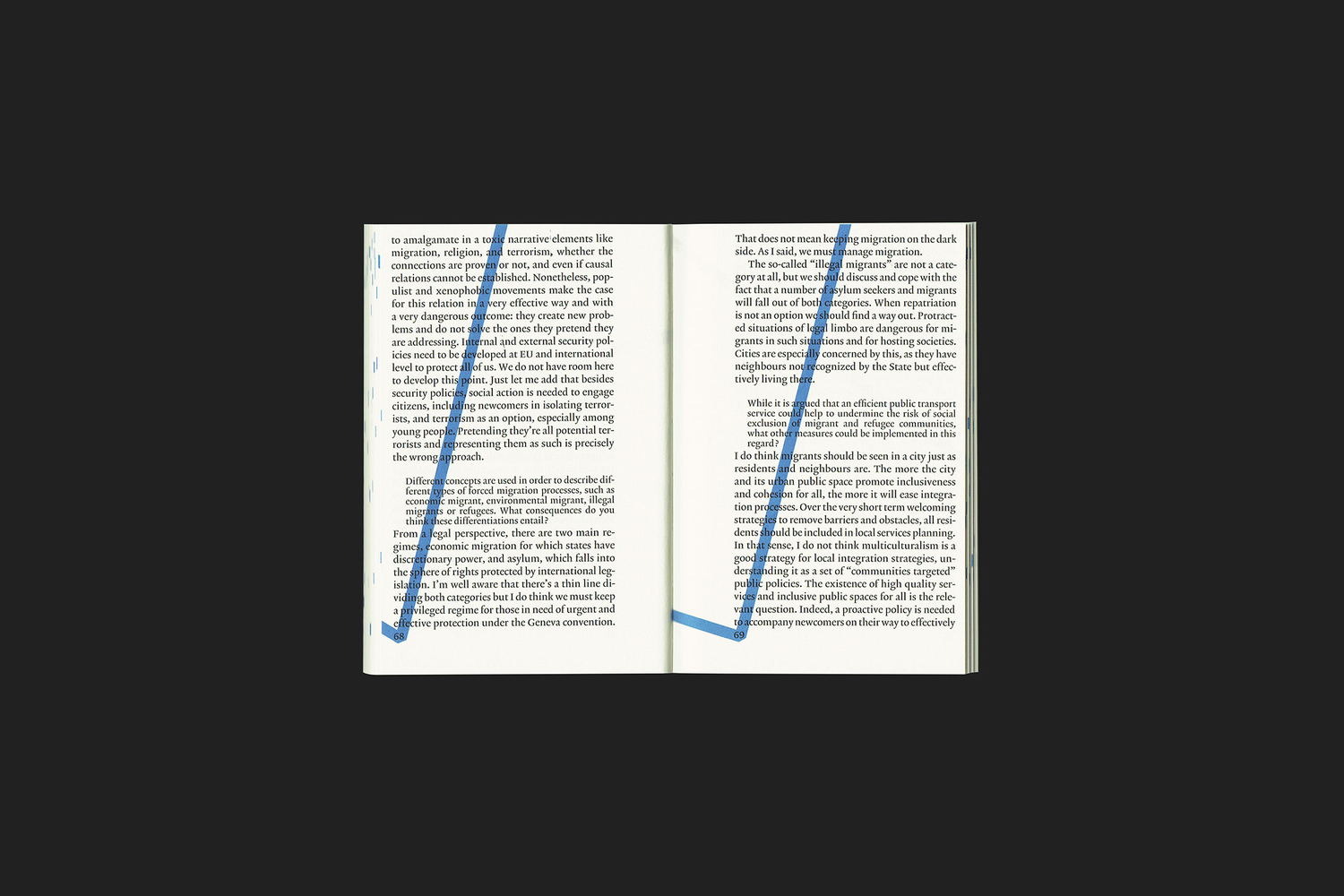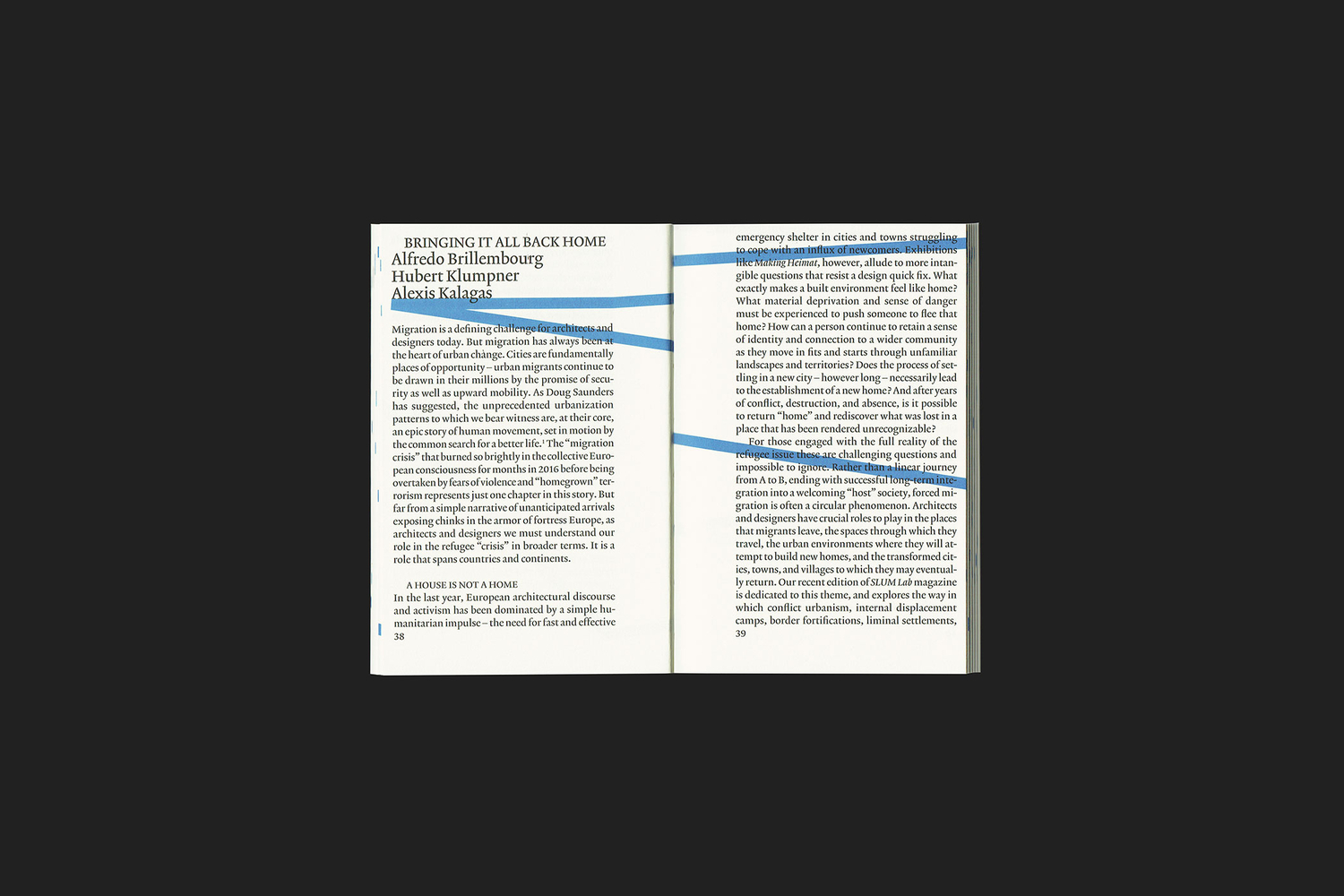 The architecture magazine Cartha was invited to contribute a special issue for the German pavilion at the 15th architecture biennale in Venice. The publication reflects on migration movements and their consequences. The booklet is supposed to be a migrant inside the exhibition space. Every contribution within the book can be seen as a part of the journey searching for "Heimat". This movement is made visible throughout the book by the evolving design of every contribution’s cover page.